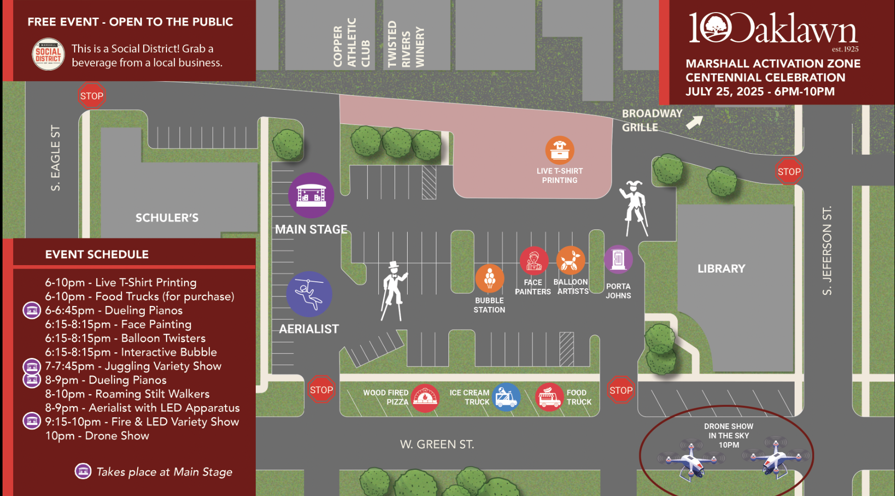 Join us for Oaklawn’s Centennial Celebration, a night of fun and festivities! This free family-friendly event is an evening filled with entertainment which will include food trucks (for purchase), dueling pianos, strolling entertainment, live t-shirt printing, kids activities, fire acts, and more. At the conclusion of the event it will be capped off with a mesmerizing drone show! Open to the public!